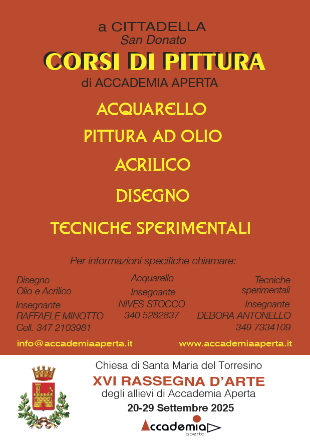 Dal 2008 l’associazione culturale Accademia Aperta – aperta perchè accessibile a tutti, giovani e meno giovani… – organizza corsi di disegno e pittura per promuovere la diffusione della cultura per l’arte.